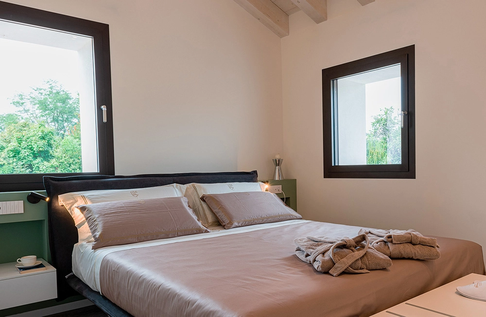 The icon of the apartment is a series of curved lines that echo the outline of the tunnels dug into the rock during the Second World War, to be explored, together with the WWI trenches, in the Col del Sol vineyard, from which you can enjoy a breathtaking view.