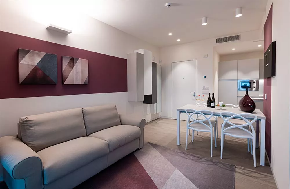 The red-purple shade that greets guests as they enter is an impressive eye-catcher. It is the underlying theme of the whole LE TRINCEE apartment, decorating sections of the walls as well as furnishings in the sleeping area and in the living area, giving a touch of contemporary elegance to the rooms.