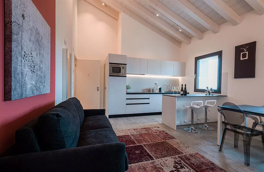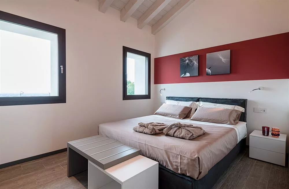 Il legno chiaro delle travature del tetto, le declinazioni del colore vino e terra d’Asolo proposte sulle diverse superfici, gli arredi e gli accessori della zona giorno e notte, la cura nella scelta dell’oggettistica e dei tessuti rivelano un’attenzione ai particolari studiata per emozionare l’ospite.