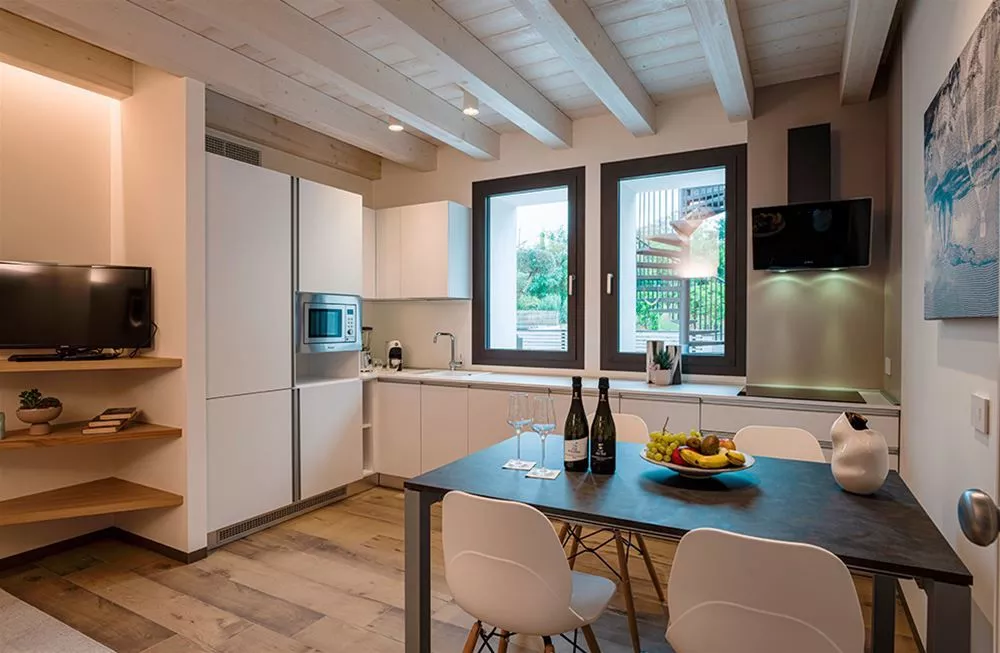 Caratterizzato da un arredo in stile moderno, dalla presenza di materiali naturali e luminose aperture sugli spazi esterni del giardino e del paesaggio circostante, l’appartamento si compone di un’area soggiorno-cucina attrezzata, di una confortevole camera da letto e di un ampio bagno.