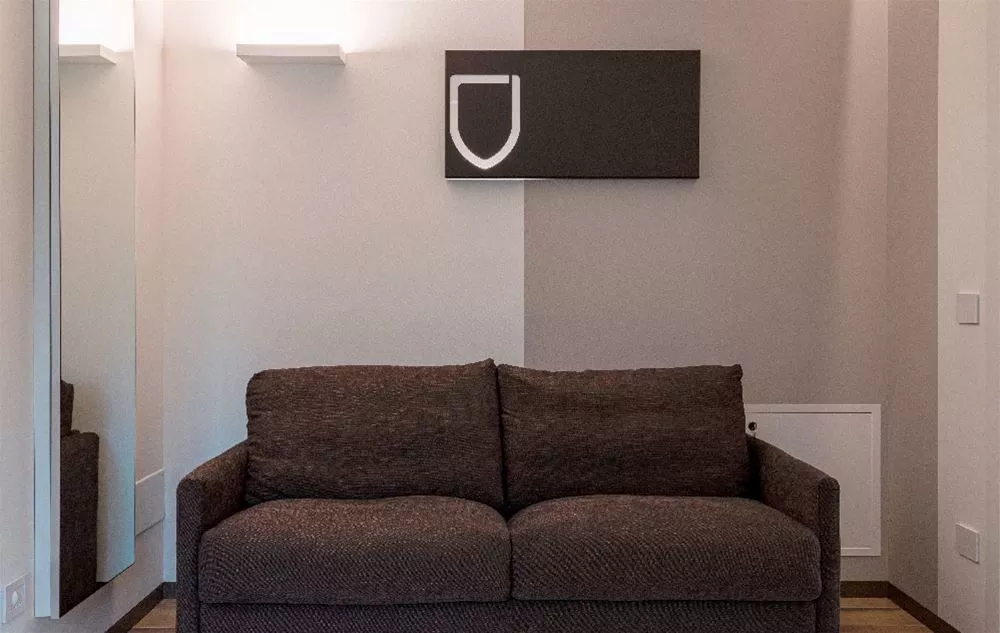 Un pannello retroilluminato identifica l’appartamento con un simbolo che richiama lo stemma araldico cittadino in chiave contemporanea. Un omaggio alla città di Asolo e alla sua antica storia che l’ospite rivive nella moderna reinterpretazione degli spazi e in una raffinata accoglienza.